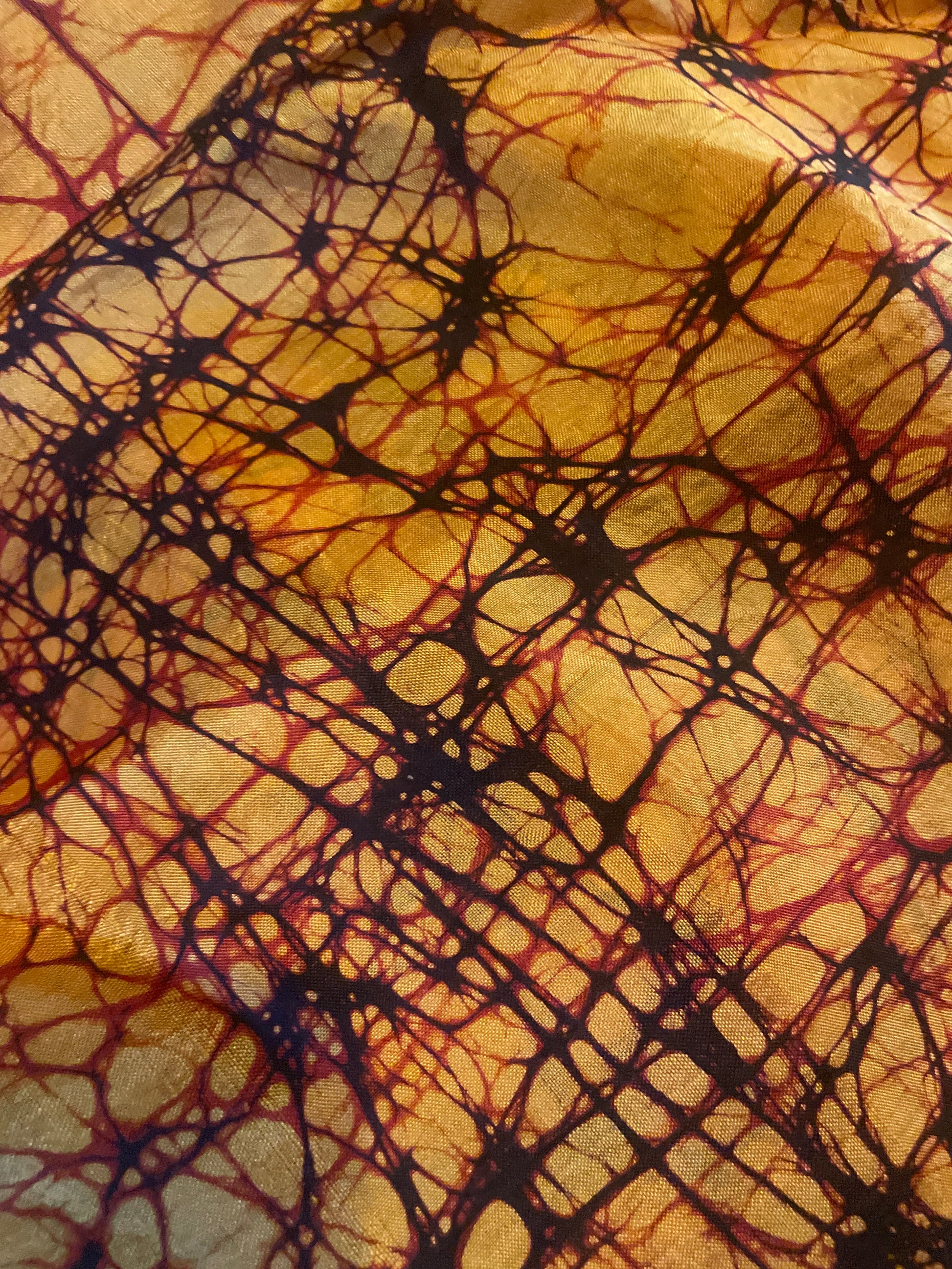 Batik printing is an antique dying technique that involves drawing wax dyeing applied to the whole cloth. The cloth is later boiled to remove wax leftovers.