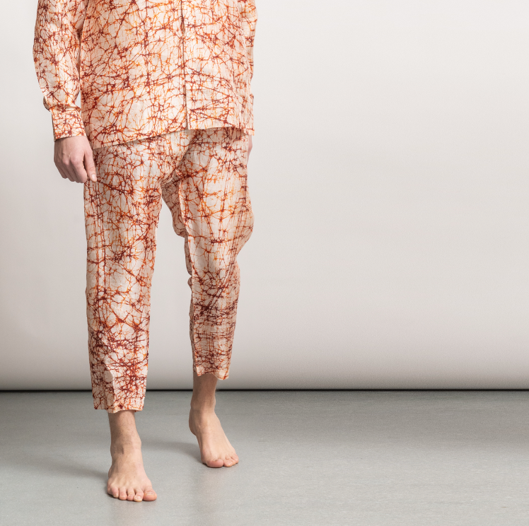 The pants are made out 100% hand spun and woven Silk harvested in small scale in and Assam and woven in West Bengal, India.