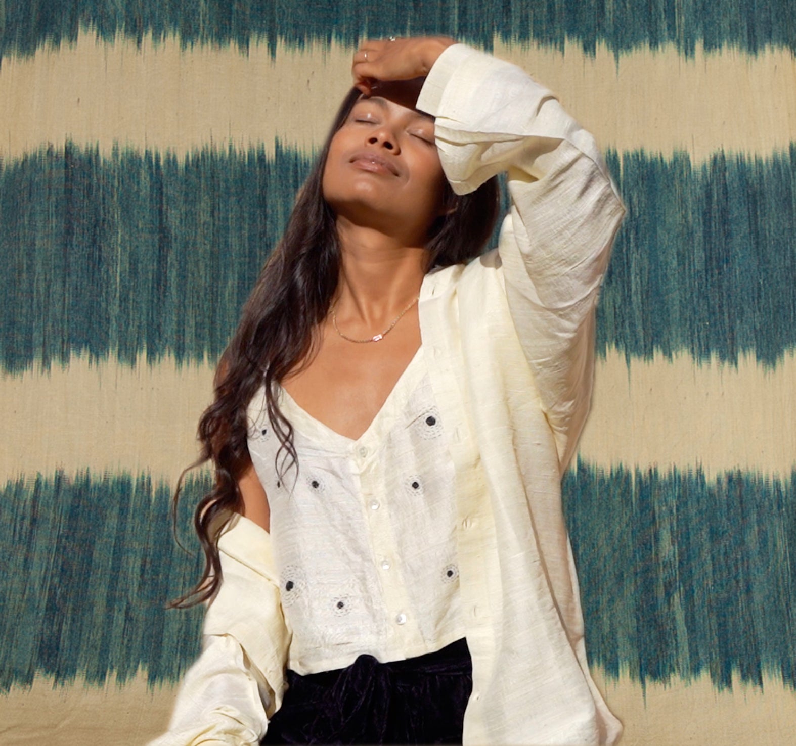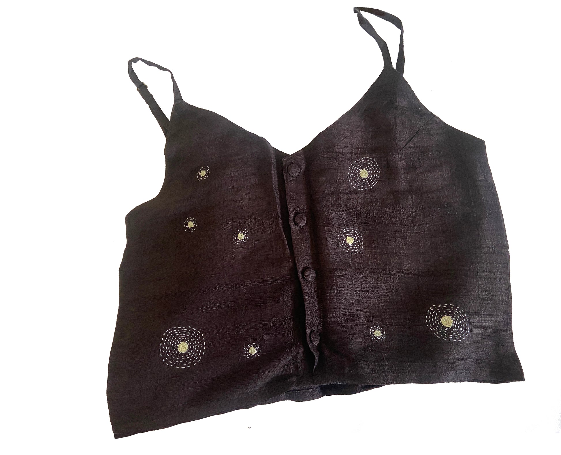 The crop top is made in for the softest silk. The constellations embroideries on the dress are a modern reinterpretation of the traditional west Bengali intuitive type of stitch.
