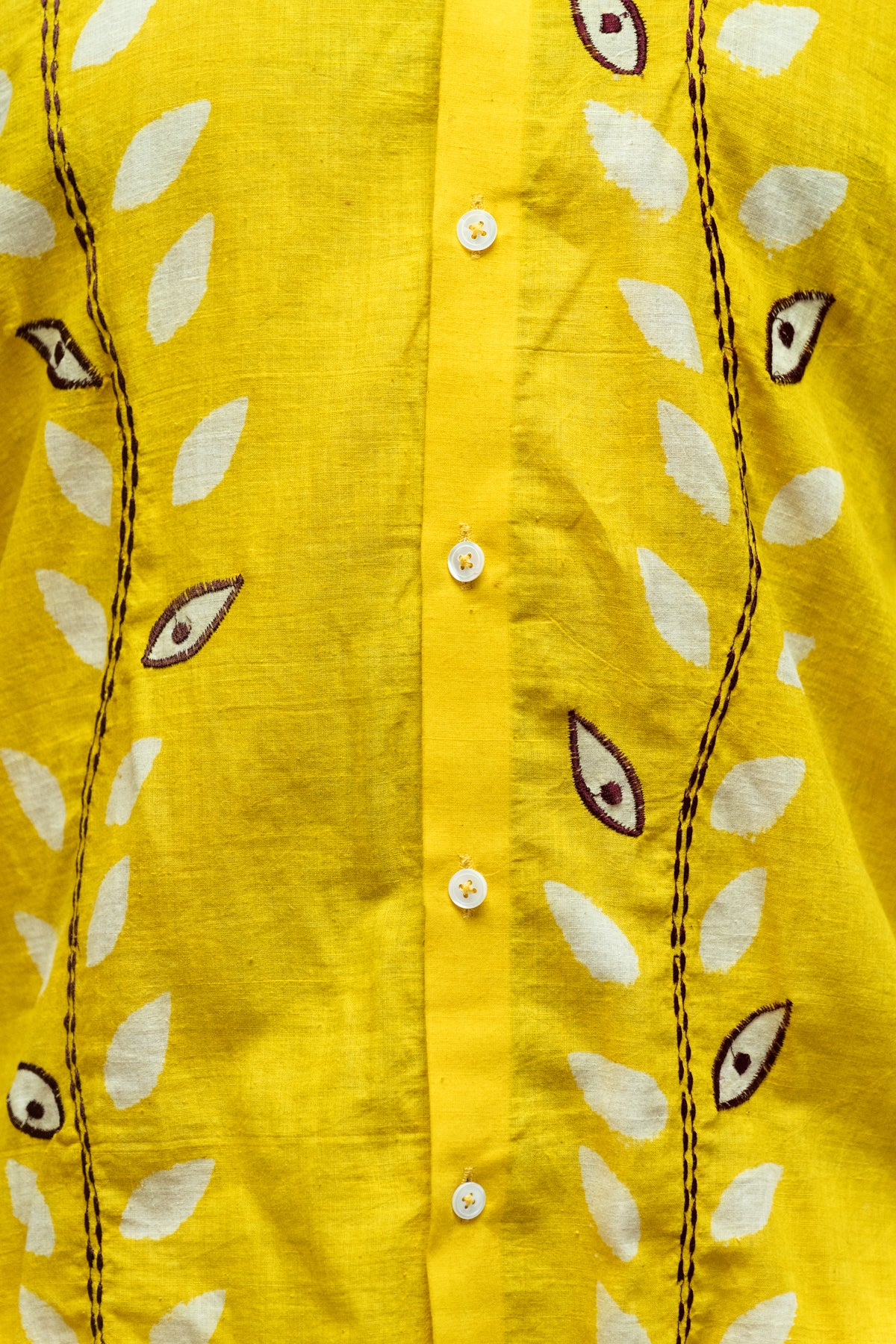 Light brown threads are embroidered in forms stripes and eyes. Each piece is unique.